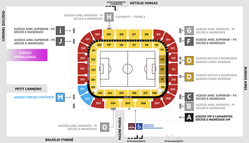 • O Acesso: A torcida visitante entra exclusivamente pelo Portão M, localizado na Rua Petit Carneiro.